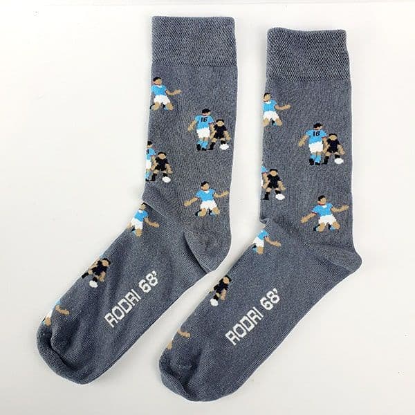 3. A pair of socks that show Rodri shooting in the 68th minute and celebrating on his knees. Available in sizes 1-3, 4-7 and 8-11 (UK shoe size). Will they be your new lucky pair?